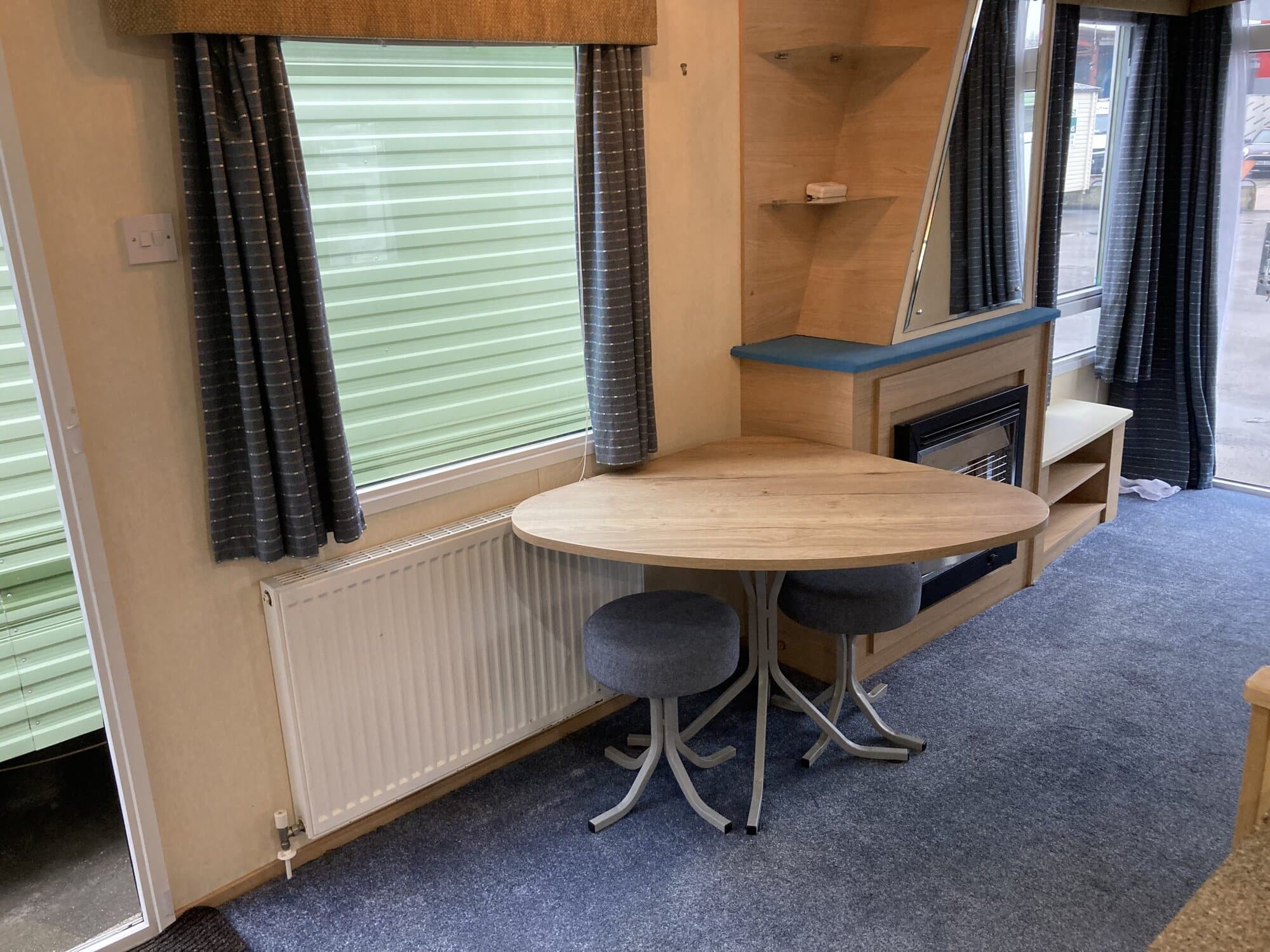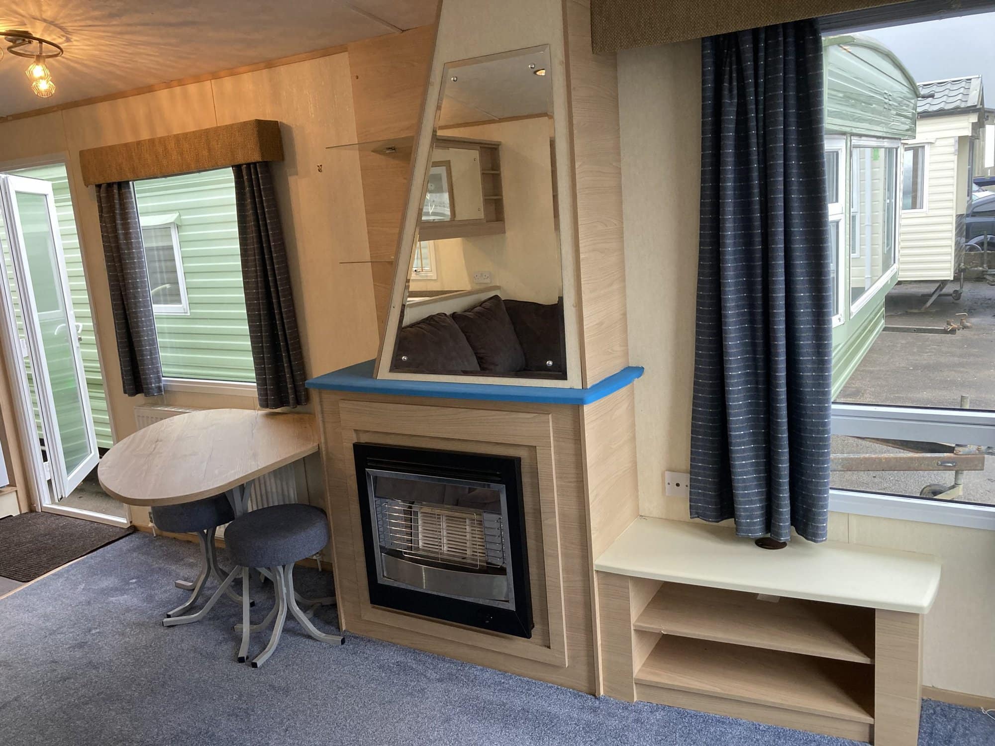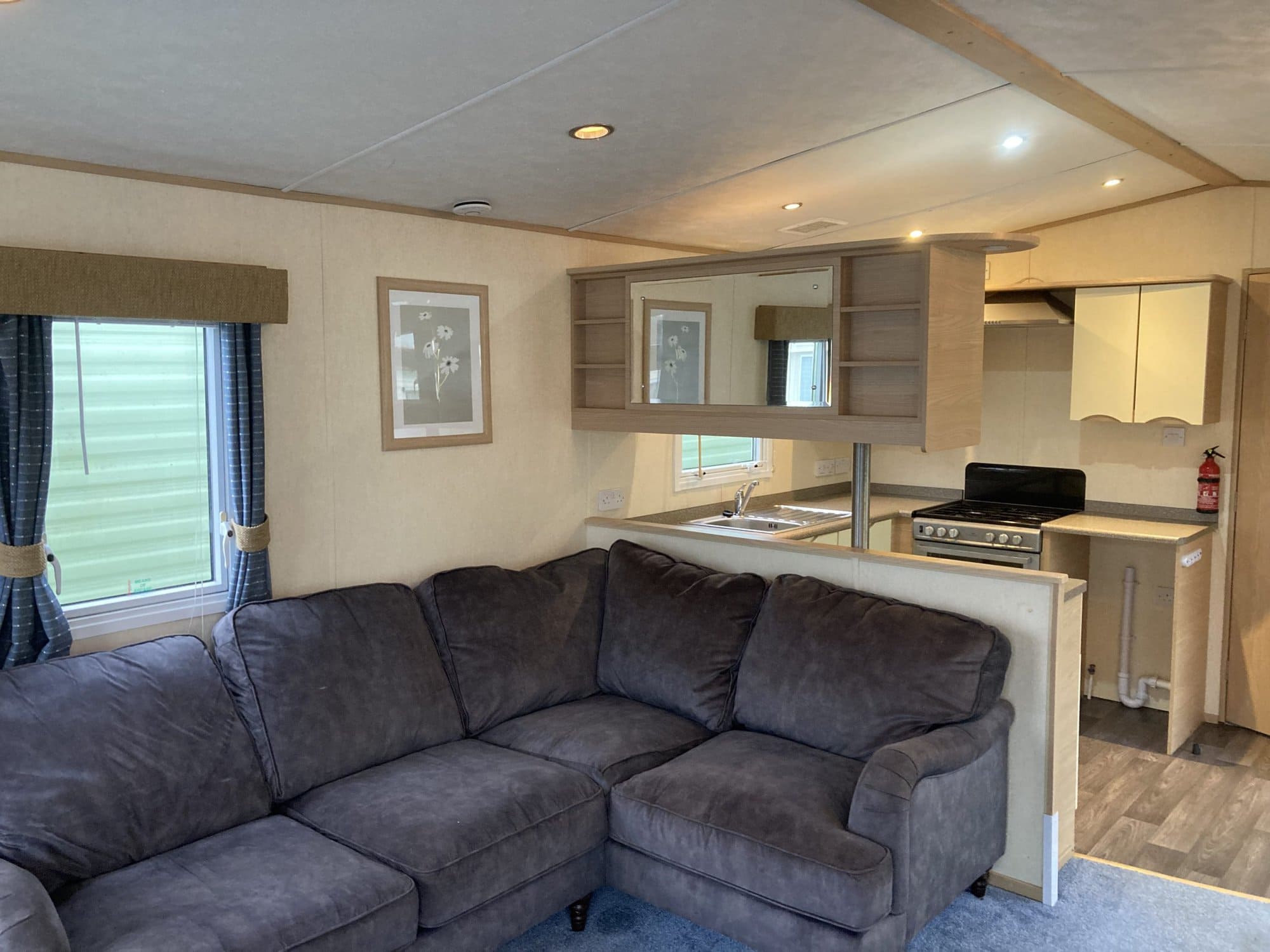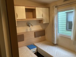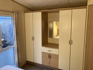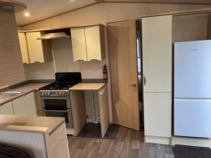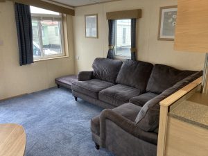 ABI Focus 36 x 12 year 2010 in cream with double glazing central heating pan tile pitched roof and under floor insulation . Lounge has free standing furniture gas fire with mirror above TV cabinet large drop window and door to front . Dining area has table and 2 stools .Open plan kitchen has cooker extractor hood fridge/freezer and space for a washer . Main bedroom has double bed wardrobes over head storage and own toilet and wash basin . Second bedroom with two single beds wardrobe and bedside cabinet . Bath room has toilet wash basin and large shower cubicle