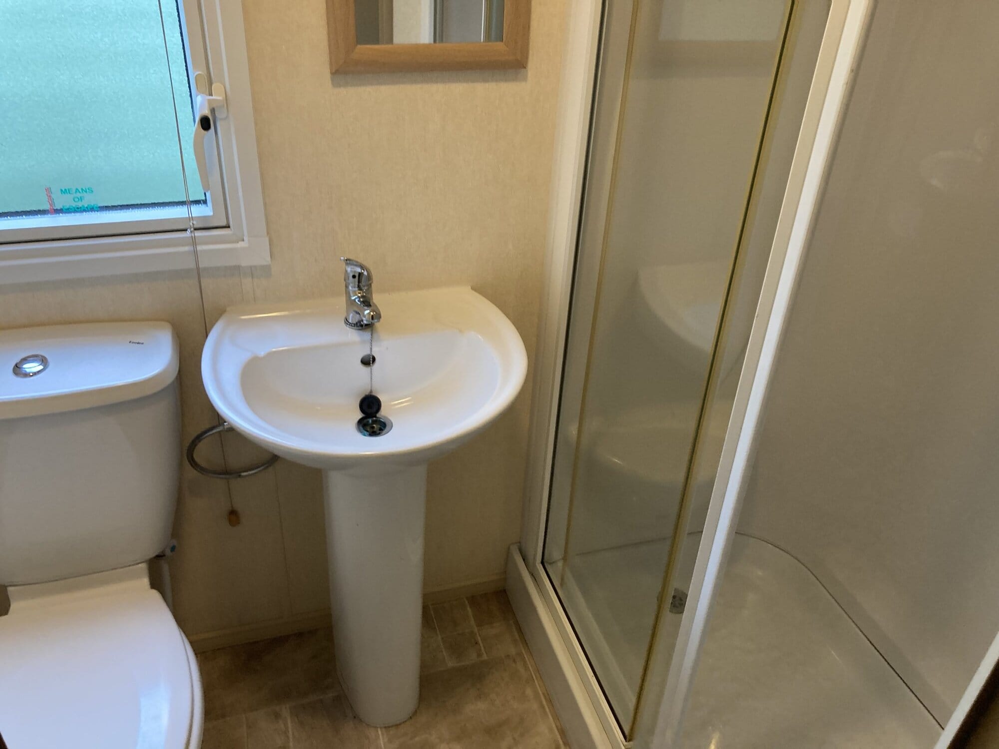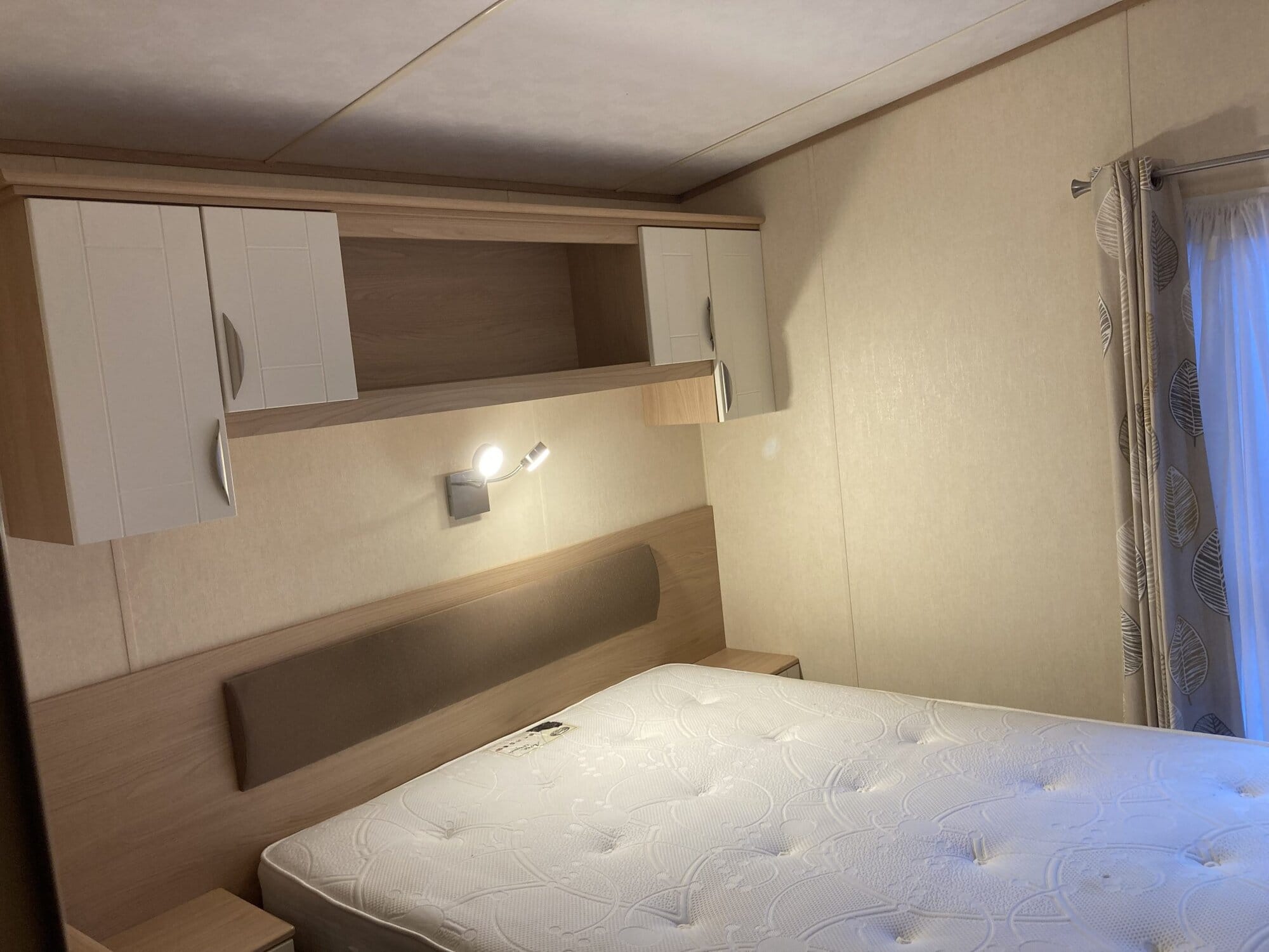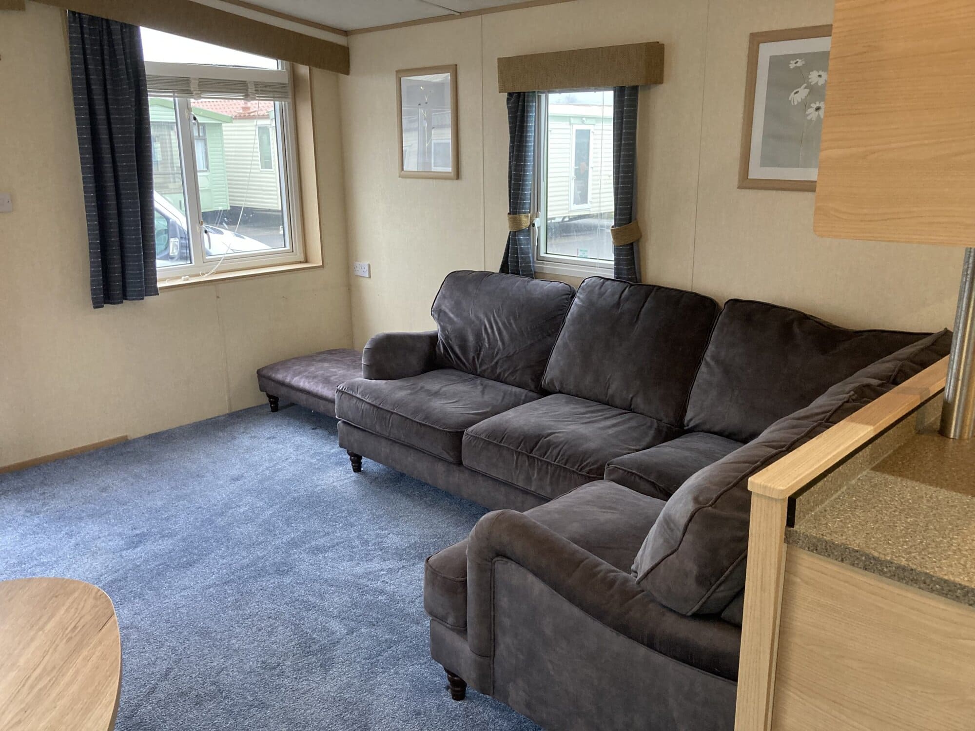 ABI Focus 36 x 12 year 2010 in cream with double glazing central heating pan tile pitched roof and under floor insulation . Lounge has free standing furniture gas fire with mirror above TV cabinet large drop window and door to front . Dining area has table and 2 stools .Open plan kitchen has cooker extractor hood fridge/freezer and space for a washer . Main bedroom has double bed wardrobes over head storage and own toilet and wash basin . Second bedroom with two single beds wardrobe and bedside cabinet . Bath room has toilet wash basin and large shower cubicle